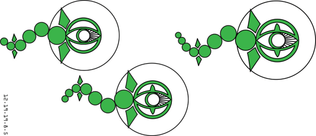 Con tamaño creciente de izquierda a derecha, los tres diseños están formados con un ojo central con media luna, y una cola de círculos en forma convexa y cóncava. La cola del primer diseño está formada por seis círculos. La del segundo por 7 circulos y la del tercero por 8.