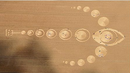 7. Hay otra perspectiva posible para ver el crop circle triple. Está en un campo muy delimitado y hay nueve railes de separación de parcelas como 9 cuerpos principales hay en el sistema solar, contando Plutón. Algunos investigadores estudian en estos momentos la posibilidad de que estemos ante un aviso de posibles pasos de asteroides cerca del sistema solar