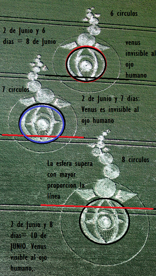 4. Seguimos. Una de las características que se aprecian del diseño es que el entorno juega una parte fundamental del mensaje. En este caso, los caminos que delimitan las parcelas de este campo funcionan como metáfora del numero de dias que pasan desde que Venus no es visible por la luz del sol hasta que sí lo es. Cogemos como referencia la media luna y las rayas, referencias históricas del planeta Venus, y el ultimo crop circle aparecido el pasado 2 de Junio.