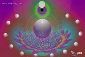 La imagen como de una flor muestra el florecimiento del magenta y el anaranjado, el papel creativo femenino dando a luz a estas energías.