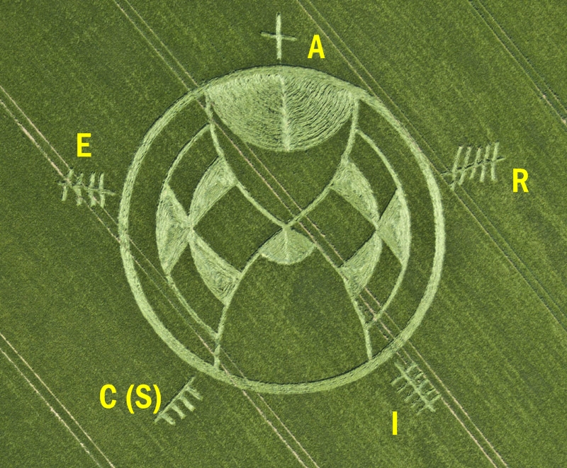 Arise es un término que expone tanto una creación, como cierta revolución de una situación. Pero si observamos esa letras desde el sentido de las agujas del reloj tenemos la palabra Arice. Esto puede ser el acrónimo de “Advanced Reciprocating Internal Combustion Engines” y su significado en el crop circle puede ser una mención a las capacidades de combustión de nuestras centrales térmicas de ciclo combinado en referencia a la emisión de partículas nocivas a la atmósfera.