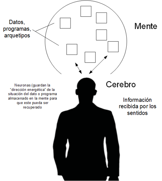 El cerebro es el instrumento que gestiona la información que se guarda en la mente, y cuya base de datos son las neuronas, donde se almacena la “dirección energética” de cada dato guardado, para que el cerebro pueda acceder a la mente para recuperarlo cuando hace falta.