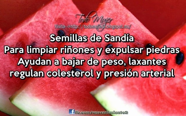 Que rica es la sandía, generalmente solo comemos su parte roja y eliminamos las semillas, pero estas son excelentes para eliminar parásitos intestinales, ayuda a combatir el estreñimiento, facilitan la digestión, la inflamación del vientre y ayuda a eliminar la ictericia.Para lo anterior, no tienes más que poner a tostar las semillas de la sandía y después se muelen.Ya molidas se pueden espolvorear en nuestras comidas, jugos o licuados, a razón de media cucharadita cafetera por comida (se recomiendo 3 veces al día para casos severos e irlos disminuyendo conforme mejore la persona).También las semillas tienen propiedades diuréticas y ayudan a eliminar la retención de líquidos, nivelar colesterol e hipertensión arterial.Limpian los riñones y ayuda a la expulsión de las piedras que se forman a veces (cálculos) .Contienen zinc, magnesio, omega3 y omega6.Para lo anterior, se tendrá que preparar un té de Semillas de Sandía como sigue:2 litros de agua4 cucharadas de semillas de sandía*Se pone el agua a hervir y se le agregan las semillas a que hiervan por espacio de 10 minutos, se sacan del fuego, se tapa y se deja reposar hasta que enfrie. Una vez fría el agua, se cuela y de este té se toma una tacita antes de cada alimento.Algo tan simple como moler o hacer un té de las semillas de la sandía te ayudara enormemente.– See more at: http://todomujer3.blogspot.mx/2014/11/semillas-de-sandia-para-limpiar-rinones.html#sthash.UqGJF4iN.dpuf