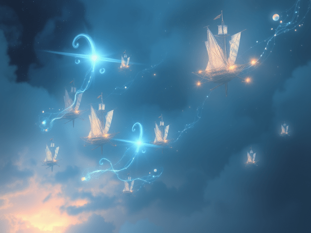 Aquellos con visión etérea verán los barcos suspendidos en el cielo envueltos en una neblina azul plateada, flotando silenciosamente.